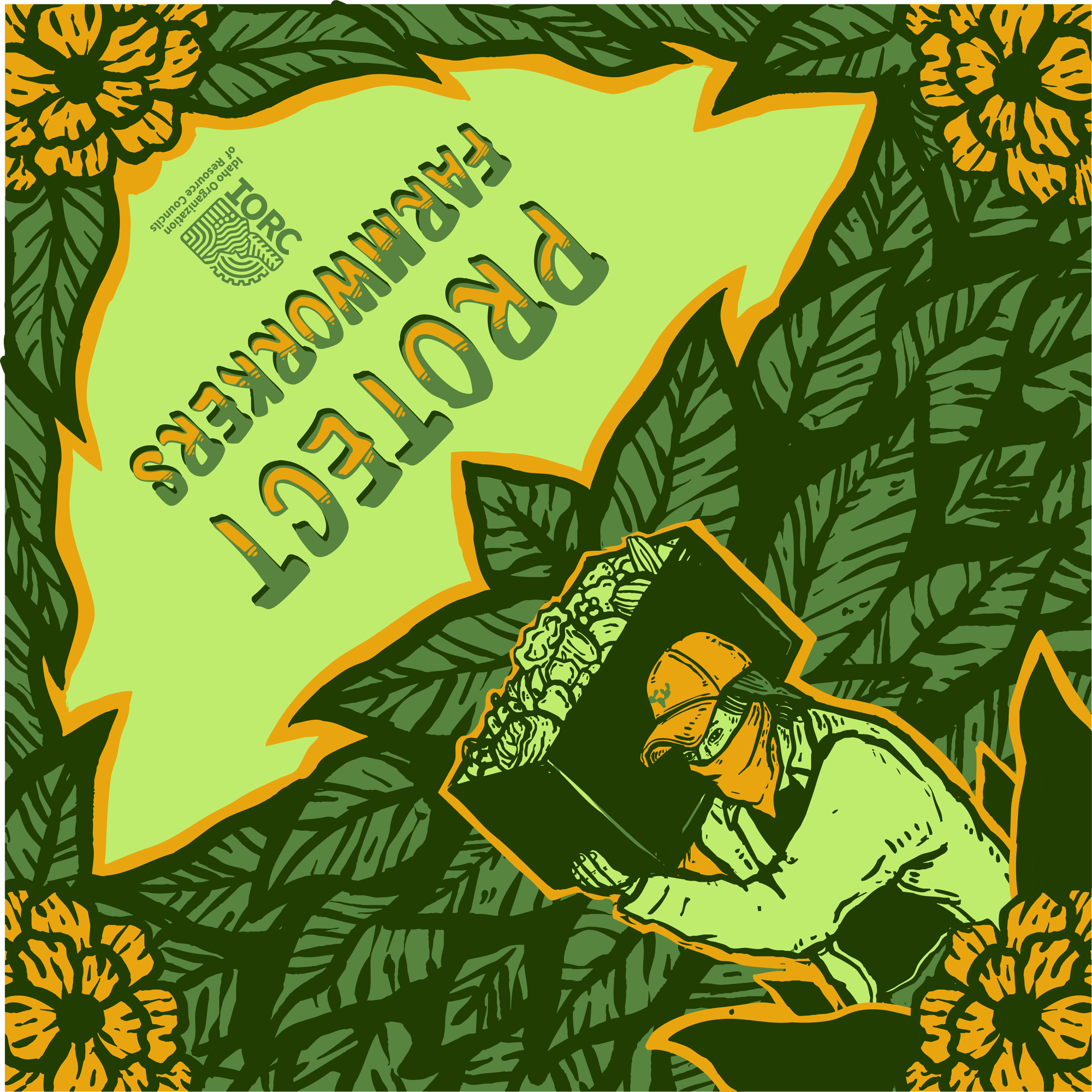 Protect Farmworkers Bandana. Stand in solidarity with one of the nations most vulnerable communities. With recent attacks, farmworkers need our support and deserve our respect. All proceeds will help fund essential supply distributions to farmworkers throughout the year. Artwork by Miguel Almeida. Size 22"x22".